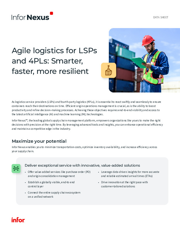 See how Infor Nexus helps LSPs and 4PLs boost efficiency, lower costs, and respond quickly to disruptions