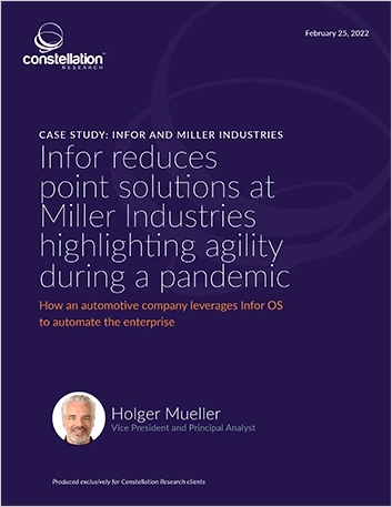 In this case study, Constellation Research explores why Miller Industries, a fast-growing enterprise in the automotive industry, upgraded its existing system installations into one common suite of products, operating in the cloud. Read about the substantial cost savings and efficiency gains the company realized by standardizing in this way, demonstrating the importance of both ERP automation and the underlying Infor OS enterprise application offering.