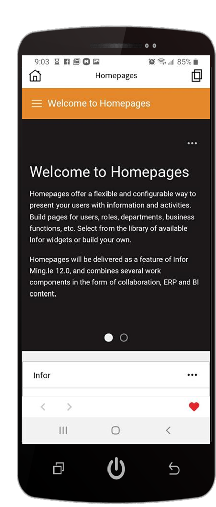 - We have added an idle refresh period whereby after the specified time has elapsed (default is 6 hours but configurable by an Administrator), the user will see her default application when accessing Infor Go.