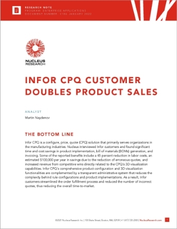 Read this Nucleus Research case study to see how some companies have used Infor CPQ to streamline the order fulfillment process and reduce the number of incorrect quotes, accelerating overall time-to-market––and how one manufacturer doubled its revenue from CPQ-supported products.