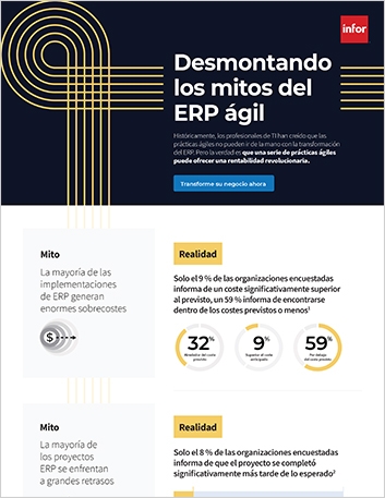 Existe la idea errónea común de que las prácticas ágiles no se pueden aplicar a las implementaciones de ERP. Esta infografía disipa mitos sobre las implementaciones de ERP modernas y proporciona prácticas factibles y ágiles que se pueden aplicar para acelerar las transformaciones y ofrecer rentabilidades revolucionarias.