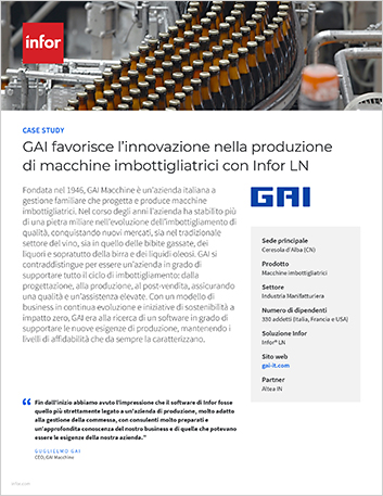 GAI Macchine è un’azienda italiana a gestione familiare che progetta e produce macchine imbottigliatrici. Per evadere ordini e processi erano necessarie numerose procedure, anche manuali, che rendevano le attività molto più laboriose e complesse. Scopri perché GAI ha scelto Infor LN per ottimizzare la gestione dei dati e per supportare la crescita dell'azienda a livello internazionale.