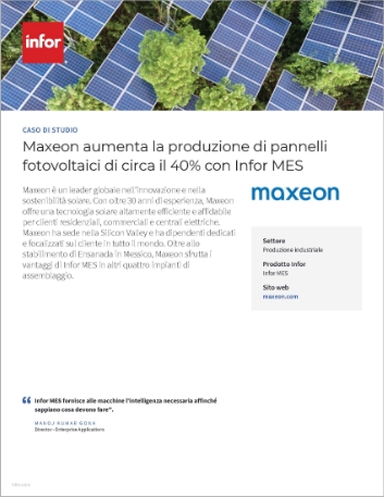 Maxeon è un fornitore leader e innovativo di moduli fotovoltaici solari. Nel 2016 ha fornito la tecnologia che ha alimentato il Solar Impulse 2, l’aereo a carburante zero, nel suo volo da record intorno al mondo. Per rispondere alle sfide poste da una domanda esplosiva del mercato e dal calo dei prezzi dei pannelli solari, l'azienda si è rivolta all'automazione e alla produzione intelligente. Inoltre, l'azienda sapeva di aver bisogno di un partner tecnologico strategico per supportare la sua continua innovazione, e questo li ha portati a Infor.