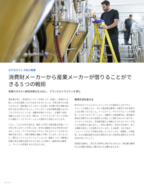 今日の製造業は日々潜在的なお客様を魅了し、刺激し、動機づけるためのカスタマージャーニーを模索し続けており、時にテクノロジーを活用し記憶に残るお客様体験を作り出しているのです。このパラダイムシフトは、消費者市場だけでなく、企業間(B2B)組織にも広がっています。ハイテクコンポーネントの導入から製品パーソナライゼーションの提供まで多岐にわたりますが、これらの取り組みは、競争原理がはたらくとともに従来の製造業の枠を越えた破壊的イノベーションとしてもたらされることとなります。幸いなことに、現代のソフトウェアは、各メーカーがお客様の記憶に残るような体験を創造することと同時に、運用効率を確保し、収益性を担保するといったことが可能になってきているのも事実です。