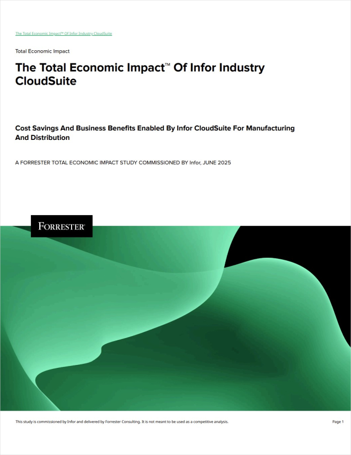Infor™ commissioned Forrester Consulting to conduct a Total Economic Impact™ (TEI) study in June 2025. The study examined the return on investment (ROI) achieved by deploying Infor CloudSuite enterprise resource planning (ERP) for a manufacturing and distribution composite company representative of interviewed customers.