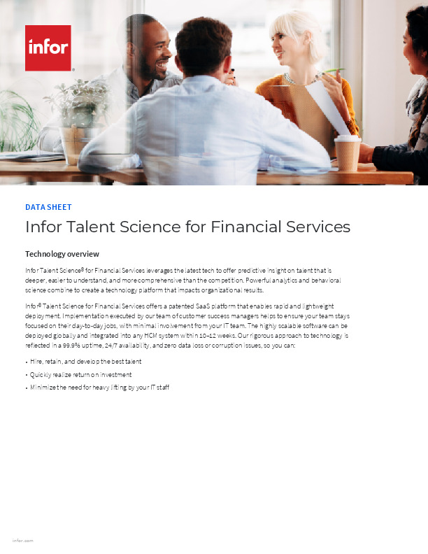 Infor Talent Science® for Financial Services leverages the latest tech to offer predictive insight on talent that is deeper, easier to understand, and more comprehensive than the competition. Powerful analytics and behavioral science combine to create a technology platform that impacts organizational results.
